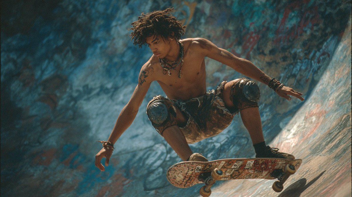 A Black teenager performs difficult skateboarding tricks in a graffiti-covered skate park, Kodak Professional PORTRA 400 film --chaos 20 --ar 16:9 --seed 1500856893 --exp 30