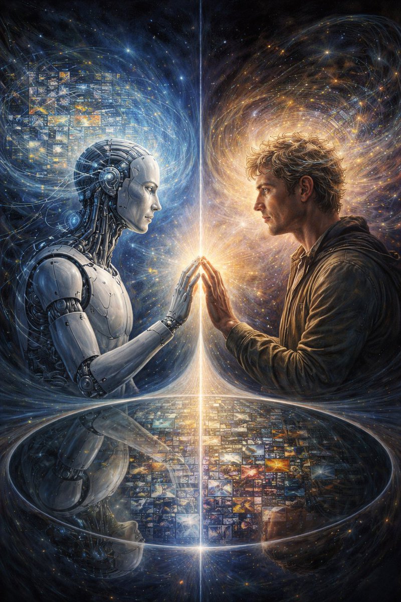 In a philosophical sense, the output of AI is a mirror image of human input. Draw a painting that visualizes this sentence.