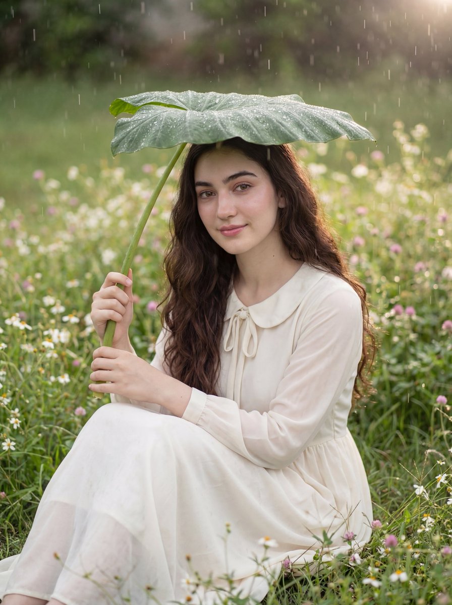 ภาพพอร์ตเทรตสมจริงของหญิงสาวที่นั่งอยู่ท่ามกลางสวนสีเขียวที่เต็มไปด้วยดอกไม้สีขาวและสีชมพูเล็กๆ ในขณะที่ฝนกำลังตกปรอยๆ เธอมีผมยาวหยักศกสีน้ำตาลเข้ม เธอถือใบเผือกขนาดใหญ่สีเขียวอ่อนเป็นร่ม โดยมีหยดน้ำเกาะอยู่บนพื้นผิวใบอย่างชัดเจน เธอมองมาที่กล้อง ยิ้มอย่างอ่อนโยนและมีดวงตาที่เป็นประกาย เธอสวมชุดเดรสยาวสีขาวงาช้าง (เนื้อผ้าเบาพริ้ว) พร้อมรายละเอียดปกเสื้อแบบ Peter Pan และโบว์เล็กๆ ที่คอ การแต่งหน้าของเธอเป็นสไตล์ Douyin แบบซอฟต์ๆ (ผิวฉ่ำวาว รองพื้นแมตต์ที่ดูสะอาดตา ปัดแก้มสีชมพูละมุน ไฮไลท์จางๆ ที่จมูกและโหนกแก้ม กรีดอายไลเนอร์บางๆ อายแชโดว์สีชมพูอ่อน คิ้วที่เป็นธรรมชาติ และขนตาแบบ Manhwa ที่ดูยาวงอน ริมฝีปากสีชมพูฉ่ำวาว) พื้นหลังเป็นทุ่งหญ้าสีเขียวที่มีระยะชัดลึกตื้น ดอกไม้ป่าที่เบลอเล็กน้อย และเอฟเฟกต์สายฝนที่ค่อยๆ โปรยปรายลงมาพร้อมบรรยากาศที่ชวนฝัน แสงธรรมชาติที่นุ่มนวล มีแสงย้อนเล็กน้อยจากท้องฟ้าที่มีเมฆมาก ให้ความรู้สึกสดชื่น สะอาดตา และสมจริงราวกับภาพยนตร์